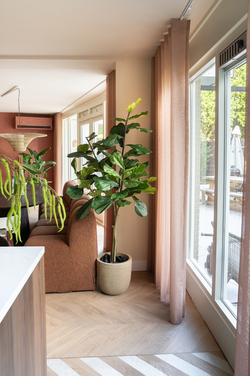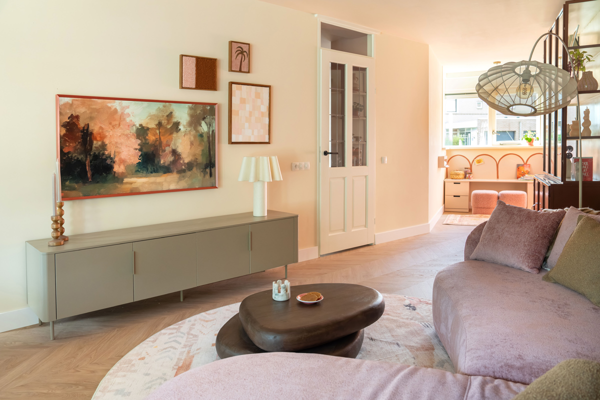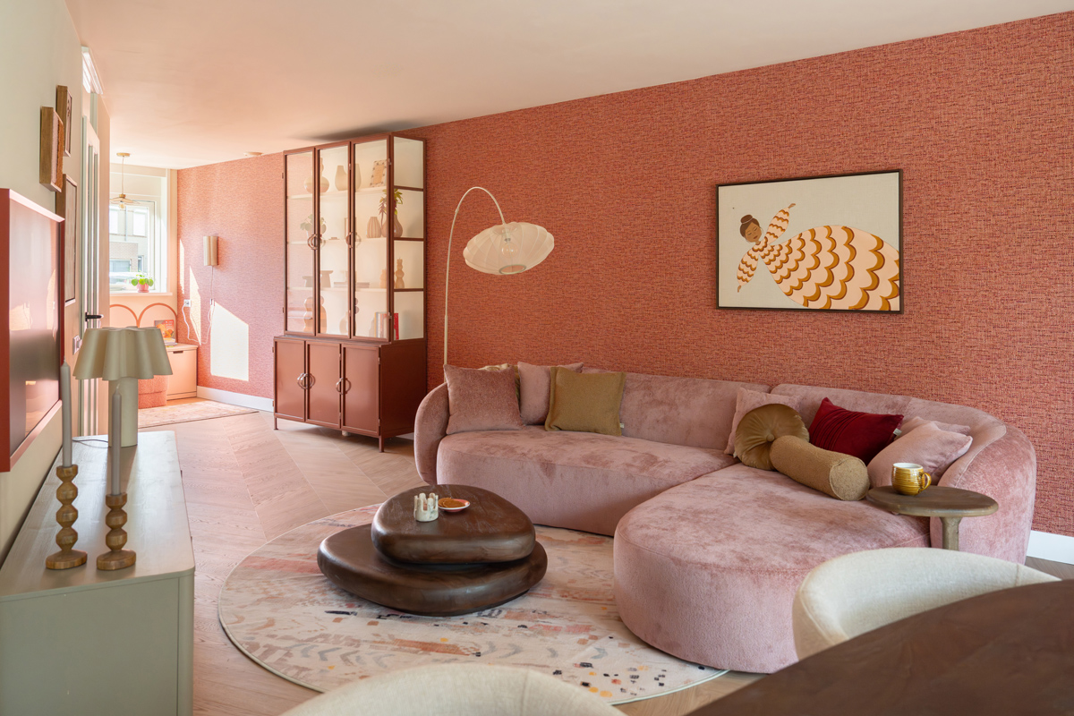 De schuine wand in de woonkamer was leidend voor de zithoek. Ik koos ervoor om met de vorm mee te bewegen. De bank loopt daardoor subtiel schuin terug en heeft een organische vorm. Dat maakt de zithoek niet alleen praktisch passend, maar ook zachter en uitnodigend. De bank kreeg een zachte, aaibare stof in een roze tint. Perfect om met het hele gezin in weg te zakken én past goed in het ton-sur-ton palet.