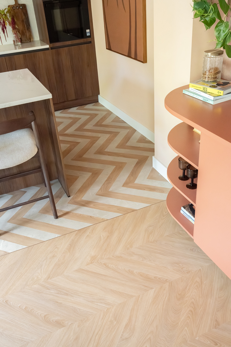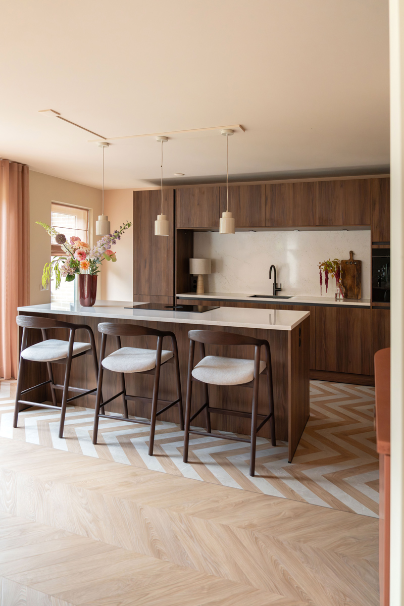 Een lichte PVC vloer in Hongaarse punt vormt de basis: stijlvol, elegant en ideaal met jonge kinderen en een hond. In de keuken voegde ik aan de Hongaarse punt een extra kleuraccent toe, waardoor een speels zigzagpatroon ontstaat. Dat benadrukt het kookeiland, deelt de leefruimte subtiel op in zones en vormt een prachtig contrast met de donkere walnoothouten keuken.