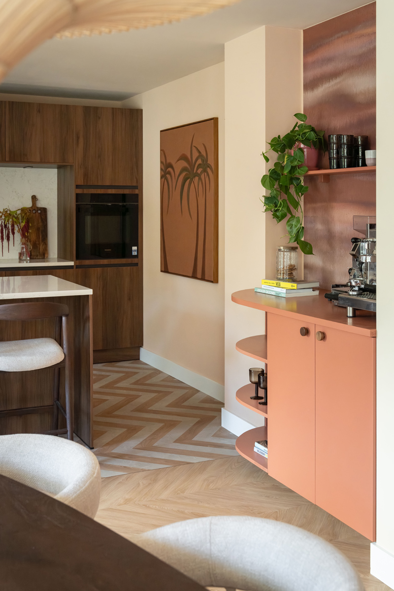 Deze nis in de keuken vroeg om een op maat gemaakte coffee corner, want de bewoners zijn echte koffieliefhebbers. Als basis gebruikte ik een IKEA Metod kast die ik uitbreide met een organisch deel dat ik zelf maakte. Zo past het meubel niet alleen perfect in de nis, maar blijft de doorloop ook prettig en kidsproof. Het warme behang van Eijffinger maakt het af: het verbindt de kleuren uit de ruimte en geeft dit hoekje extra diepte en karakter.