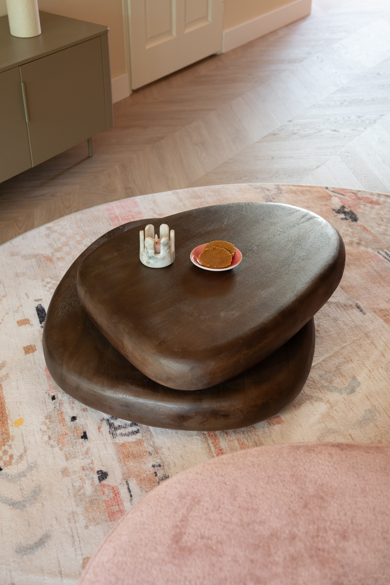 De donker houten salontafel zorgt voor contrast en herhaalt de kleur van de keuken. Dankzij de organische vorm beweegt hij mee met de schuine zithoek, terwijl de afgeronde hoeken hem zacht en veilig maken voor het hele gezin.