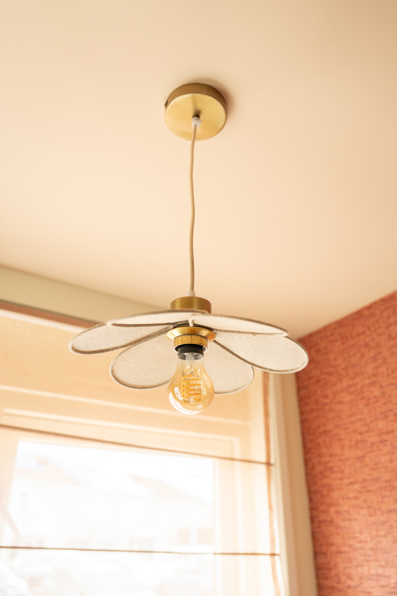 Boven de tafel hangt een grote lamp van natuurlijk materiaal – dé eyecatcher van de eethoek waar ik meteen verliefd op was. Door de luchtige vorm blijft de ruimte open, terwijl de structuur prachtig aansluit bij het terra-behang. Zo brengt de lamp warmte en sfeer, zonder zwaar aan te voelen.