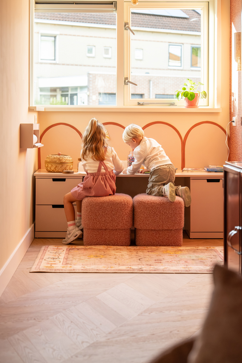 Met twee jonge kinderen kon een eigen kinderhoek natuurlijk niet ontbreken. Twee IKEA Nordli-kastjes met een deur als blad geschilderd in warme tinten vormen de basis. De vrolijke boogjes van kurk op de wand maakt het speels en uniek. Praktisch, super simpel en helemaal passend bij de rest van het interieur.