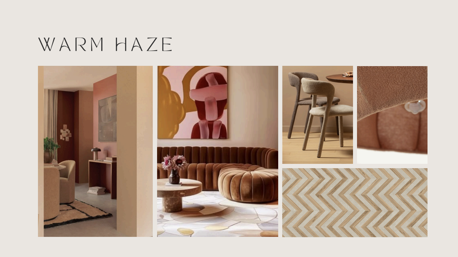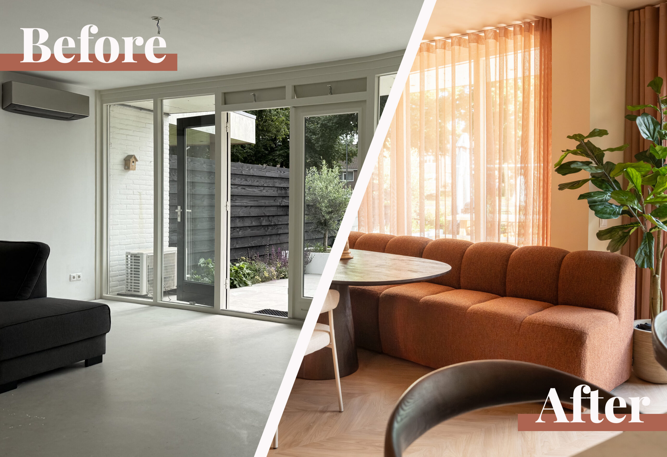 Elke make-over begint bij een goed moodboard, dé manier om sfeer en kleuren alvast voelbaar te maken. Voor dit project stelde ik er één samen vol met warme tinten zoals terra, roze, oker en bruin. Ook de vloer kreeg er meteen een plek op: straks hét middel om subtiele zones te creëren en het interieur een speelse twist te geven. Door de combinatie van kleuren, structuren, materialen en persoonlijke kunst ontstond er al snel een duidelijk gevoel van warmte en gezelligheid.