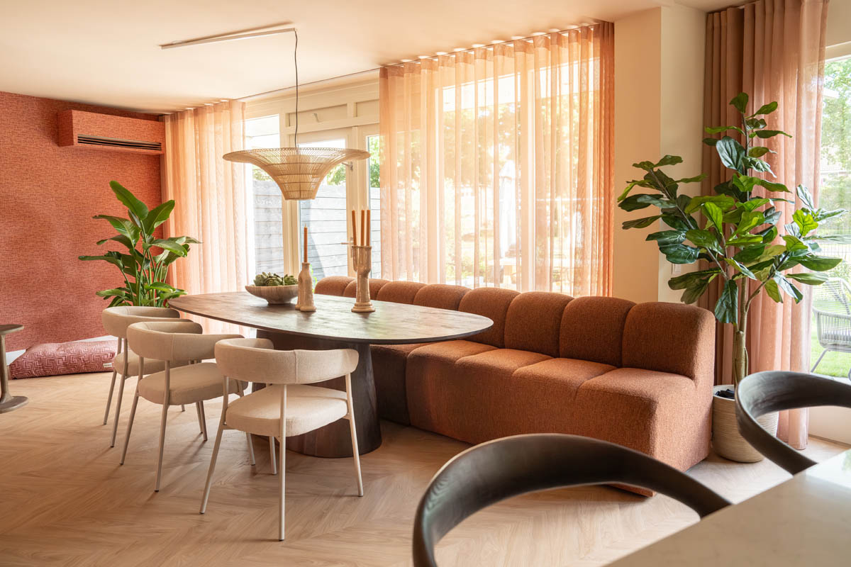 De eethoek vormt samen met de keuken het hart van de leefruimte. Hier staat een grote Deense ovale tafel in donker hout, zowel praktisch als kidsproof. Aan één zijde combineerde ik de tafel met een eetbank in een warme roestbruine boucléstof, ideaal met kinderen omdat ze er makkelijk op doorschuiven. Aan de andere kant zorgen lichte stoelen voor een fijn contrast en houden ze de ruimte luchtig.
