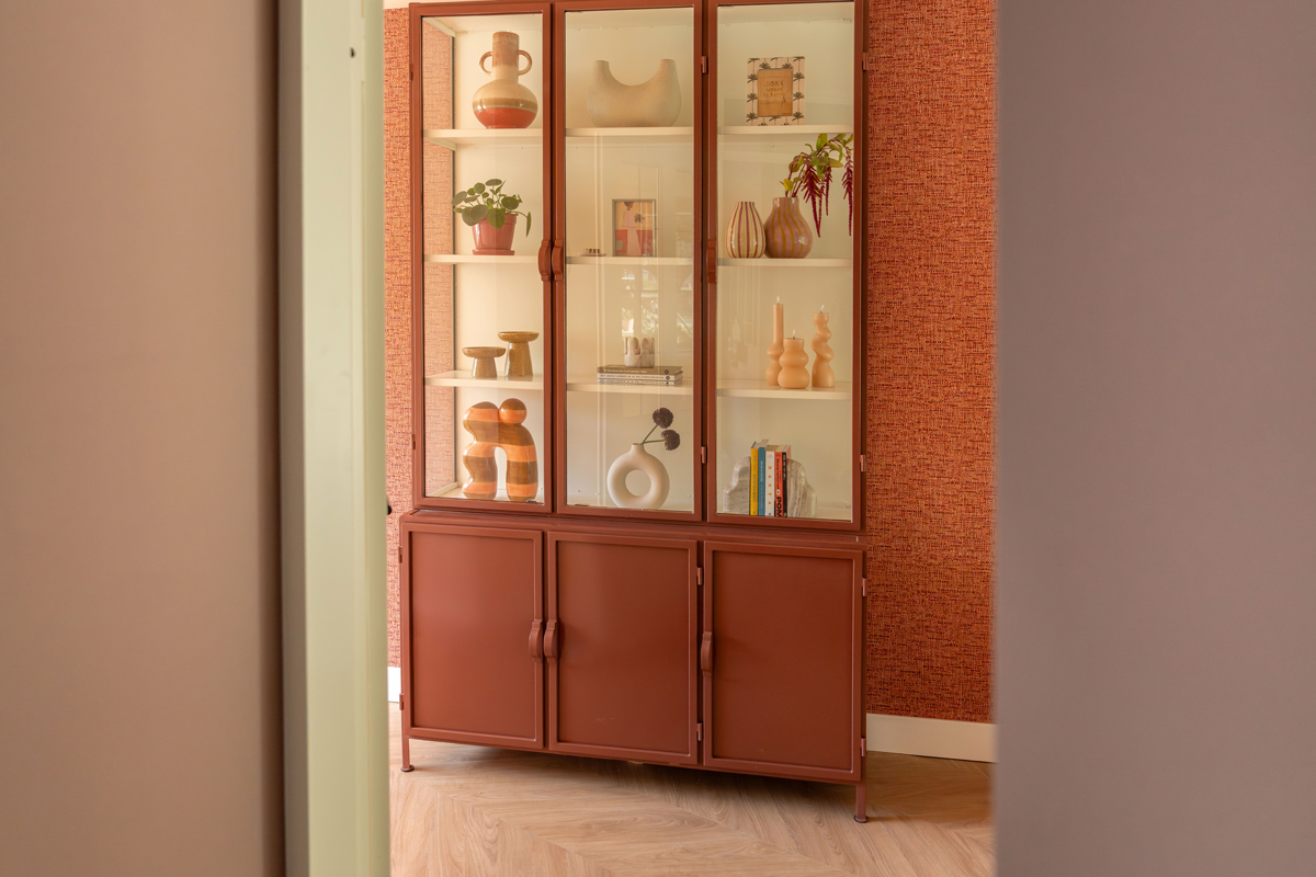 Een vitrinekast wordt pas écht leuk als er iets van jezelf in zit. Denk aan een vakantiesouvenir, een klein kunstwerk of een accessoire dat een verhaal vertelt. Dat detail maakte het geheel persoonlijk en warm, zonder dat het rommelig werd.