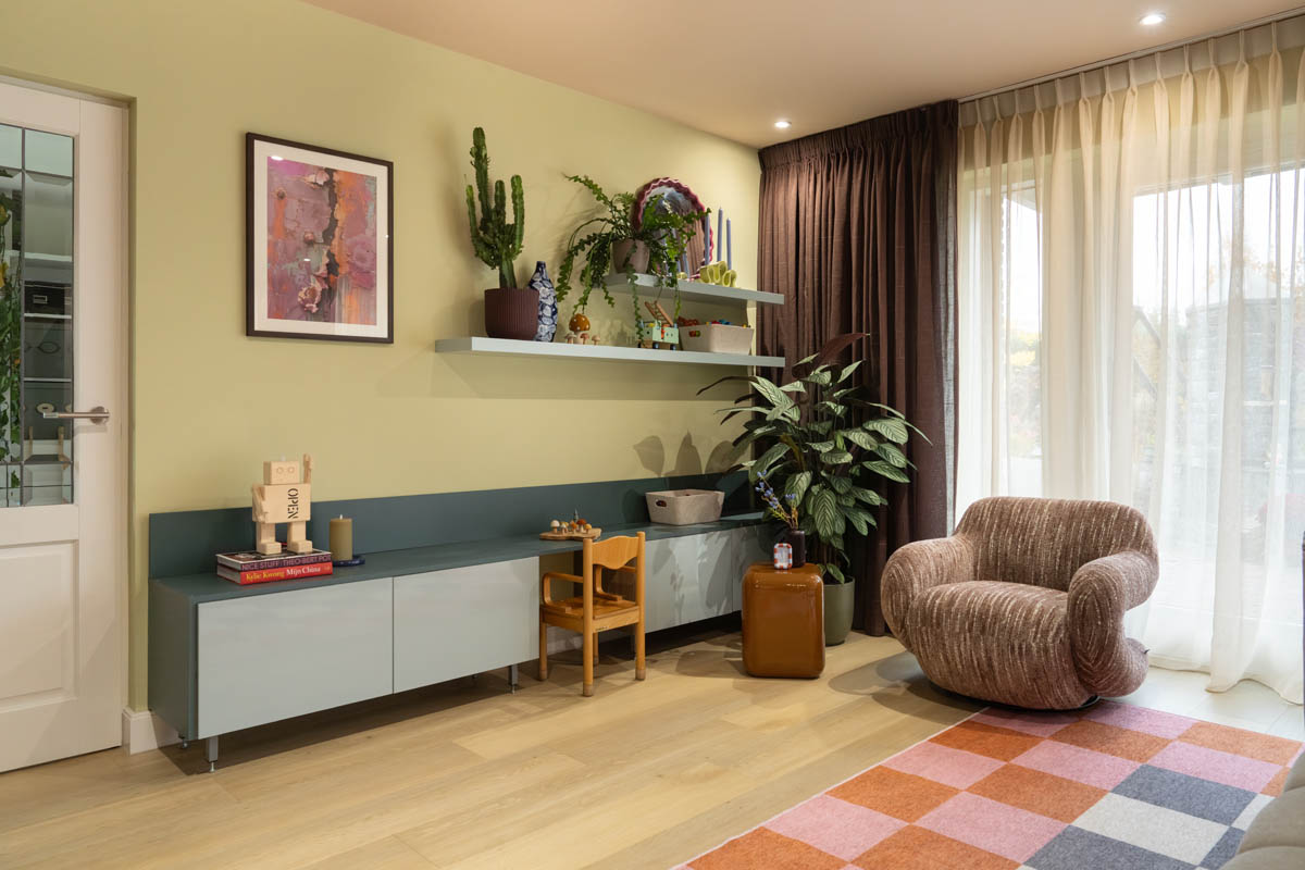 Mixer en matcher. Ik hou ervan om items uit verschillende stijlen samen te brengen in een kleurrijk interieur. Met vintage en planten komt het plaatje samen.